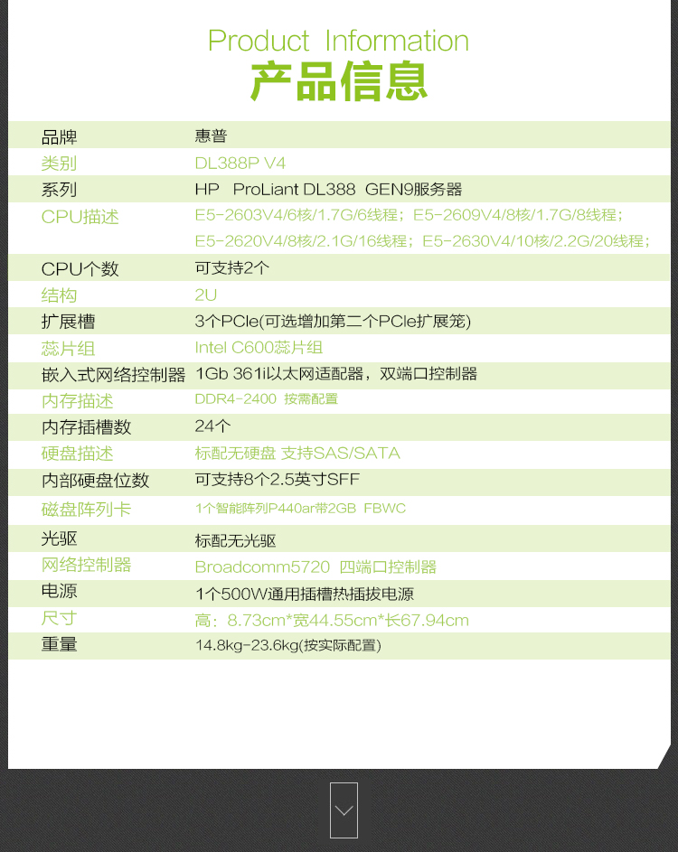 惠普(HP)服務(wù)器/DL388 Gen9 機(jī)架式服務(wù)器 1*E5-2620V處理器 8*16G內(nèi)存 3*600G硬盤 2*550W電源(DL388Gen9)